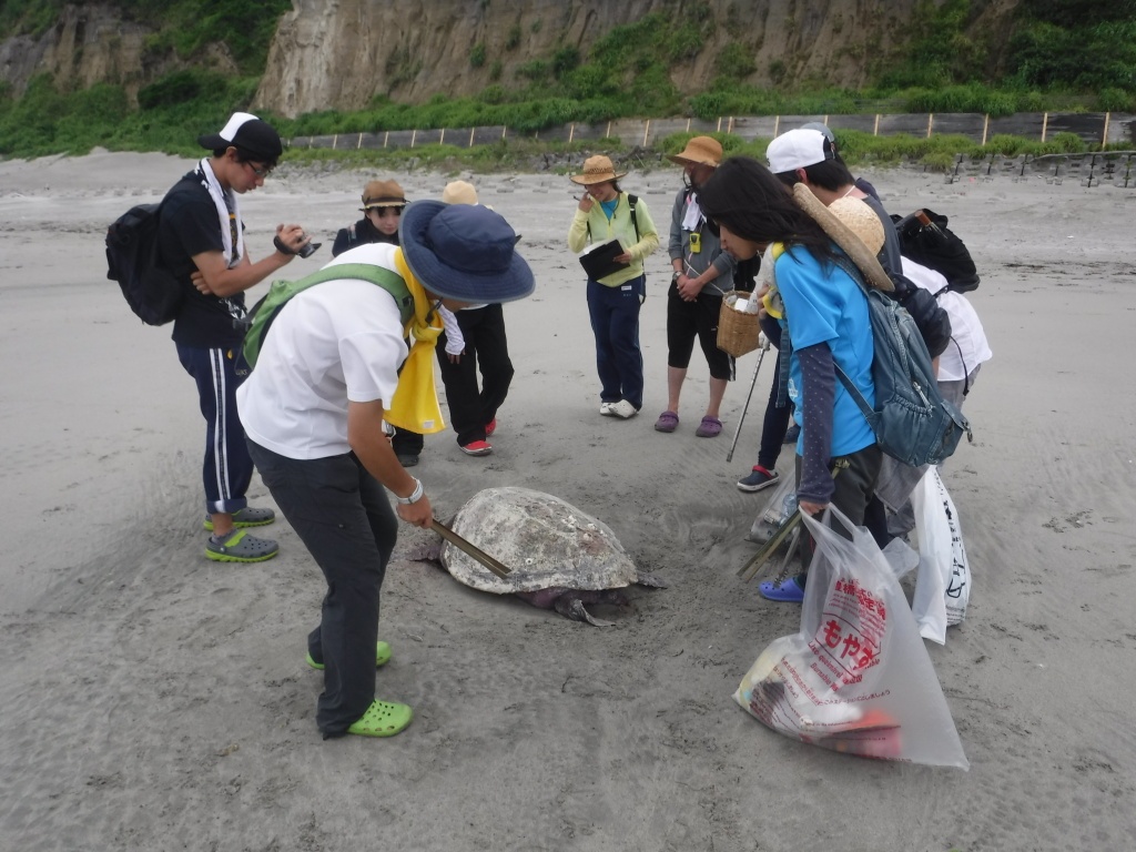 海岸フィールドワークでは、漂着ゴミを拾って撮影し、緯度経度をGPSデータとして記録しマッピングしました。 同時に生きものを観察している中で、アカウミガメの漂着死体を発見しました。 このほか、海の環境問題に関する座学などを実施しました。