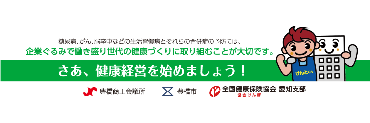 豊橋市は、働く世代の健康づくりを推進するため、豊橋商工会議所および全国健康保険協会愛知支部(以下、協会けんぽ愛知支部)と連携し、健康経営に積極的に取り組む事業所を「とよはし健康宣言事業所」として認定、その取り組みを応援します。
