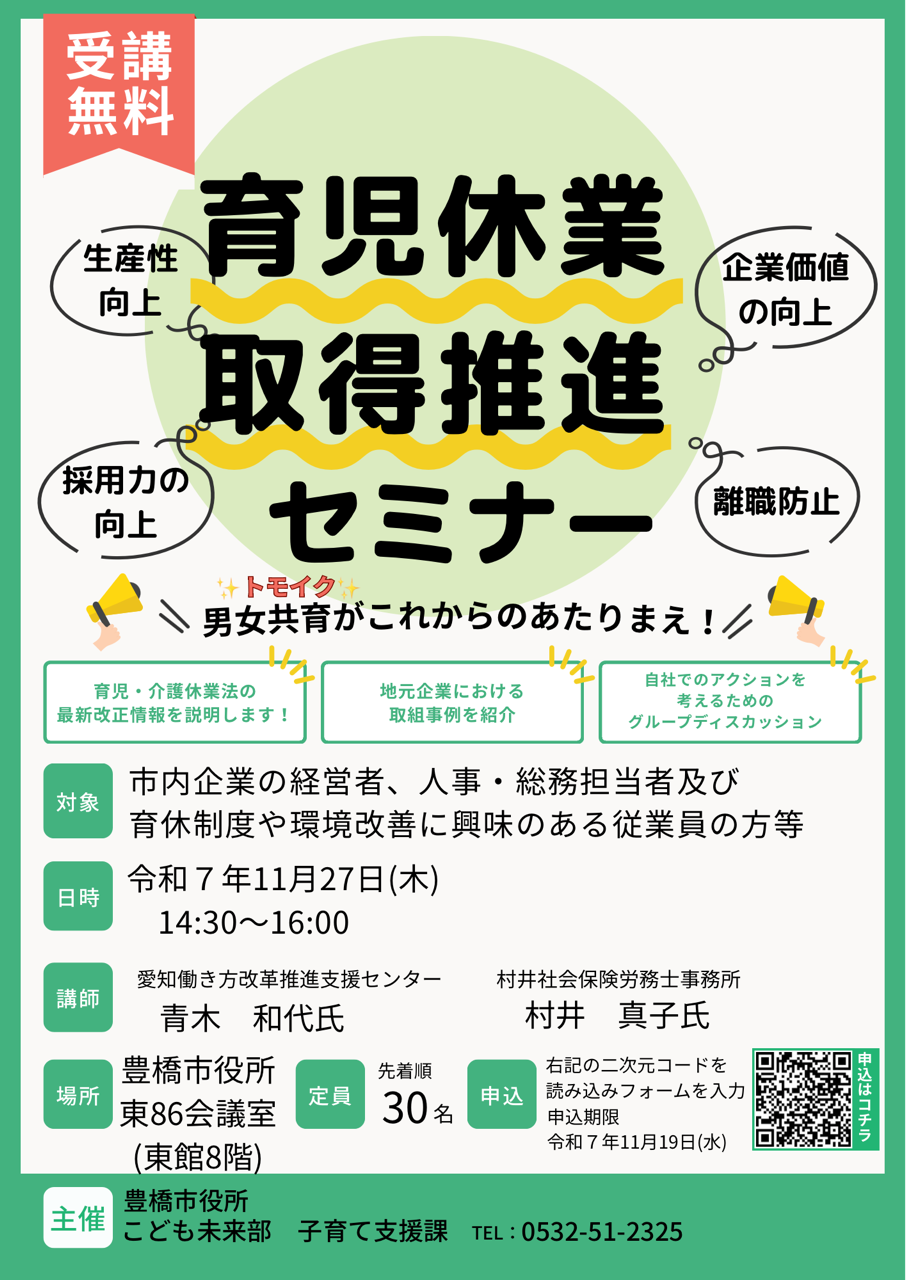 このセミナーでは、最新の改正情報を含む育児休業関連規定の解説と市内企業における育児休業取得推進の取組事例を紹介し、自社でのアクションを考えるためのグループディスカッションを実施します。