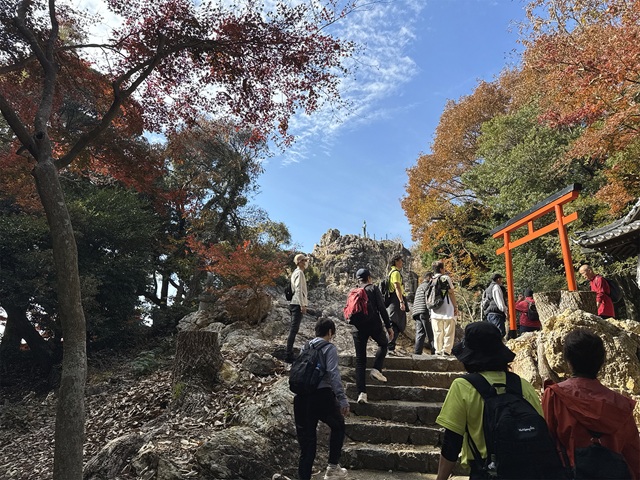 2025年12月2日(火曜日)、岩屋緑地で「とよはしクアオルト健康ウオーキング」を実施しました。岩屋緑地周辺には、行基が開いたと伝わり、東海道を往来する旅人の信仰を集めた岩屋観音があります。また、周辺では旧東海道から岩屋観音へ向かう分岐を示す道標が伝えられており、歴史の気配を感じる古道があります。冬の澄んだ空気の中、参加者はガイドの案内で姿勢や呼吸を意識しながら歩き、心身を整える時間となりました。