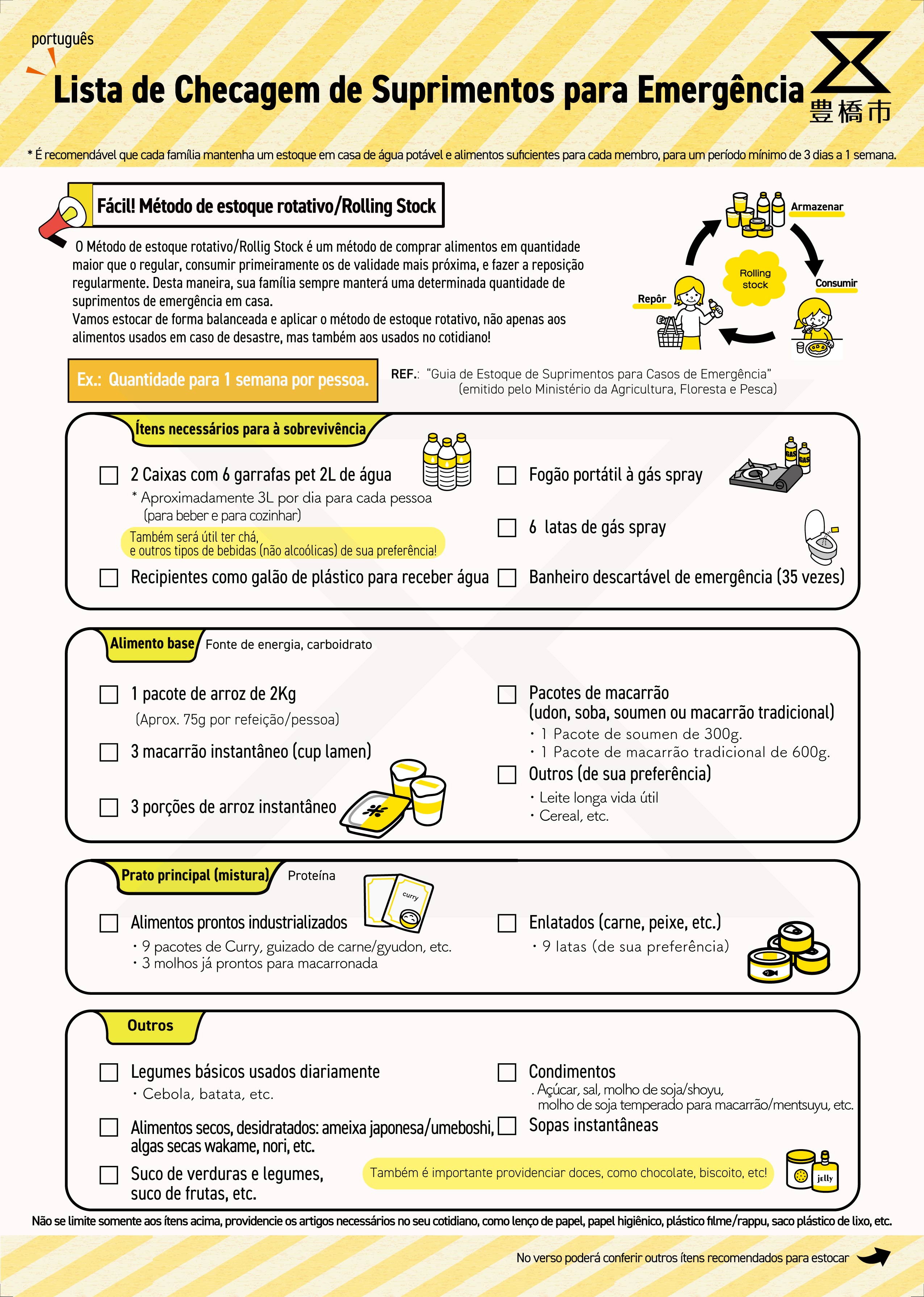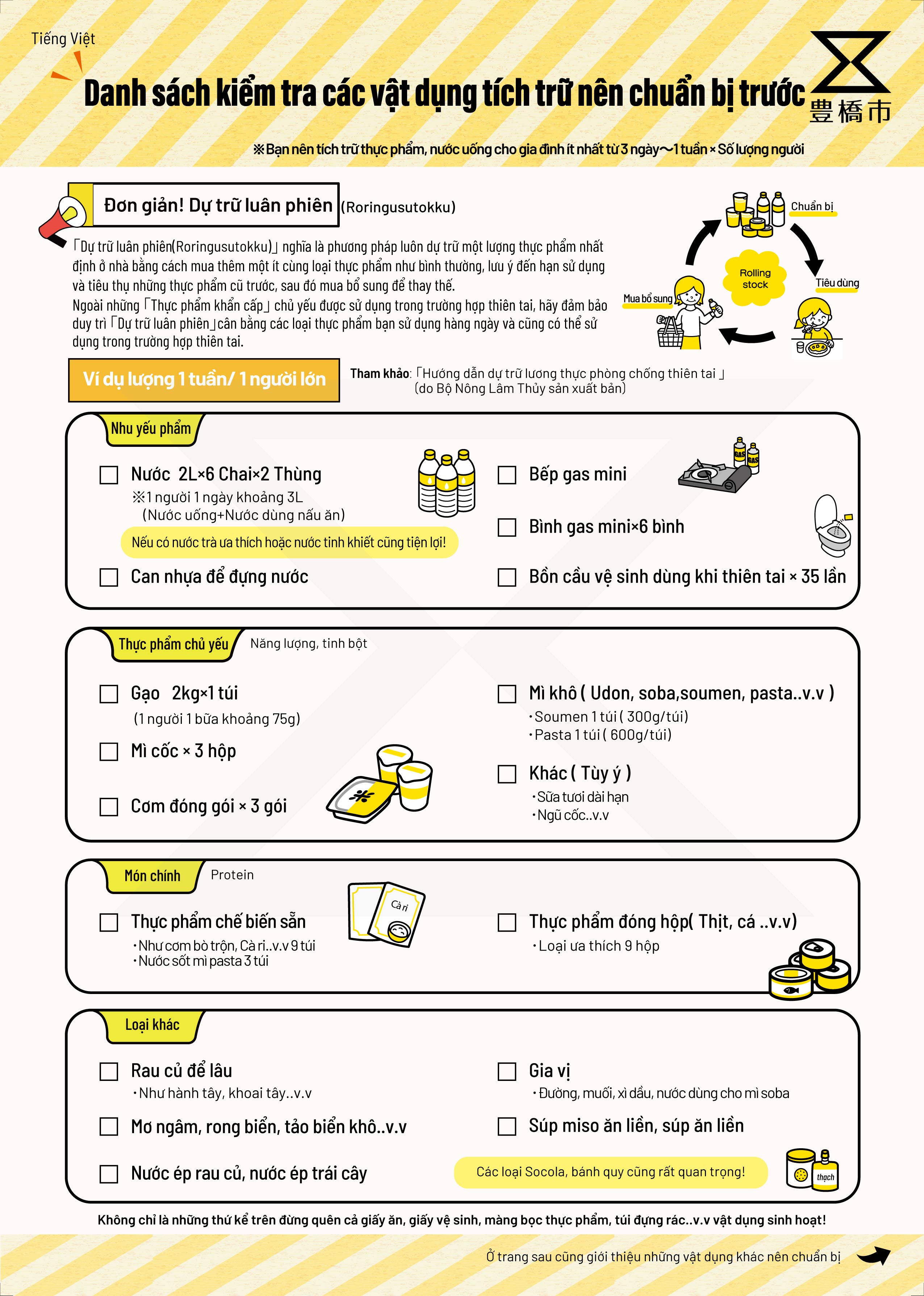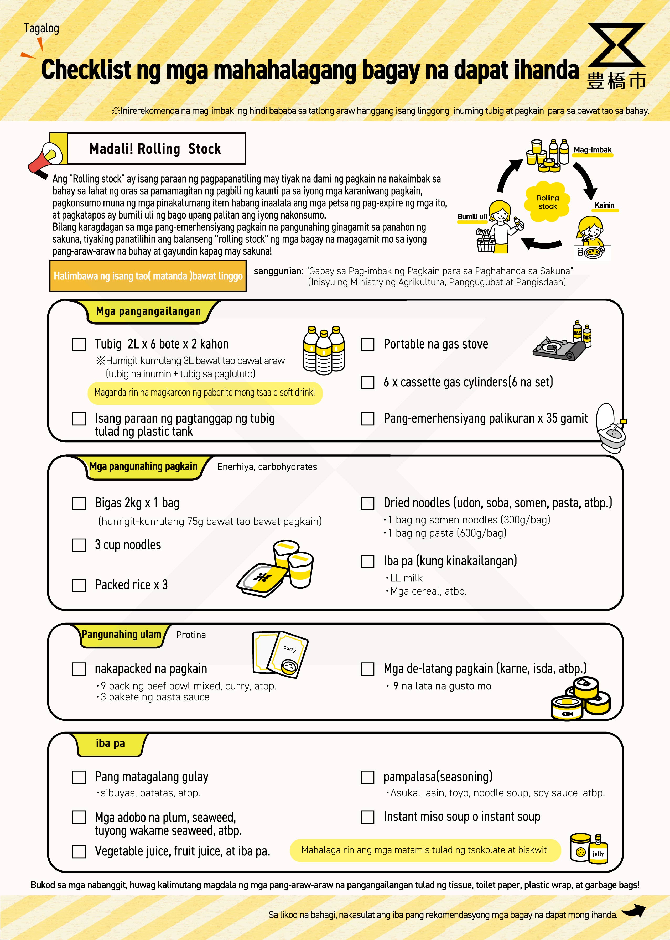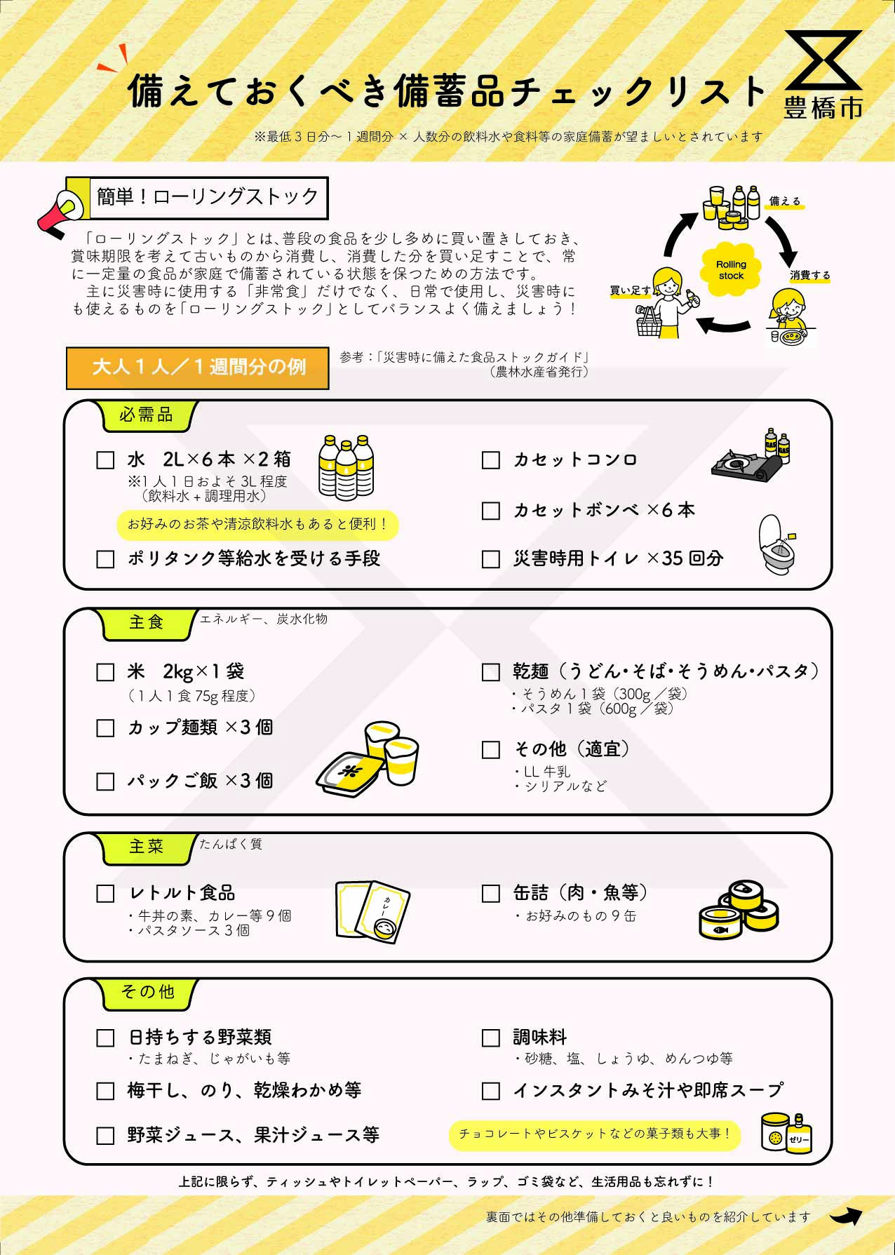 最低(さいてい)でも3日分(みっかぶん)、できれば7日分(なのかぶん)以上(いじょう)の用意(ようい)が必要(ひつよう)と言(い)われています。