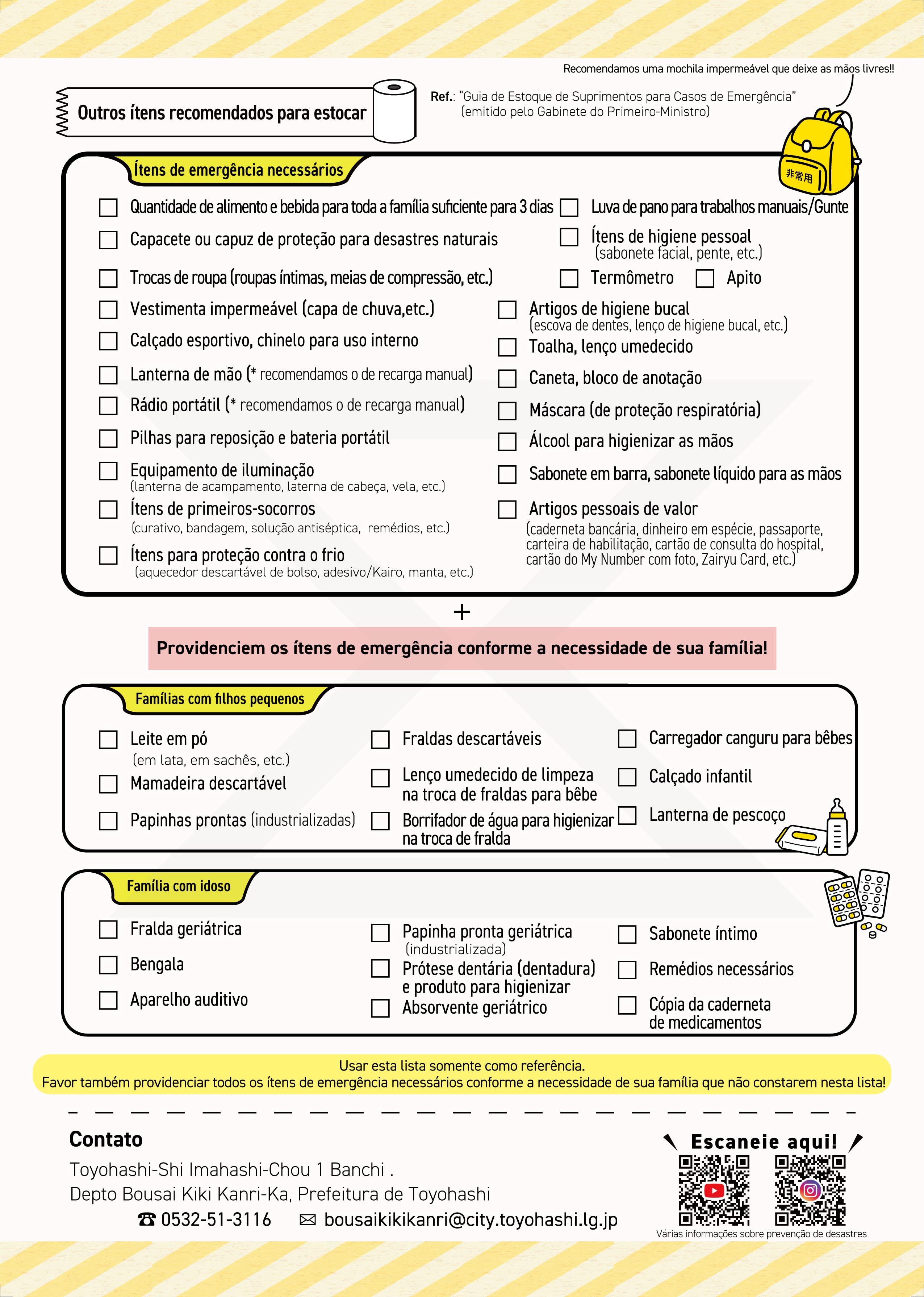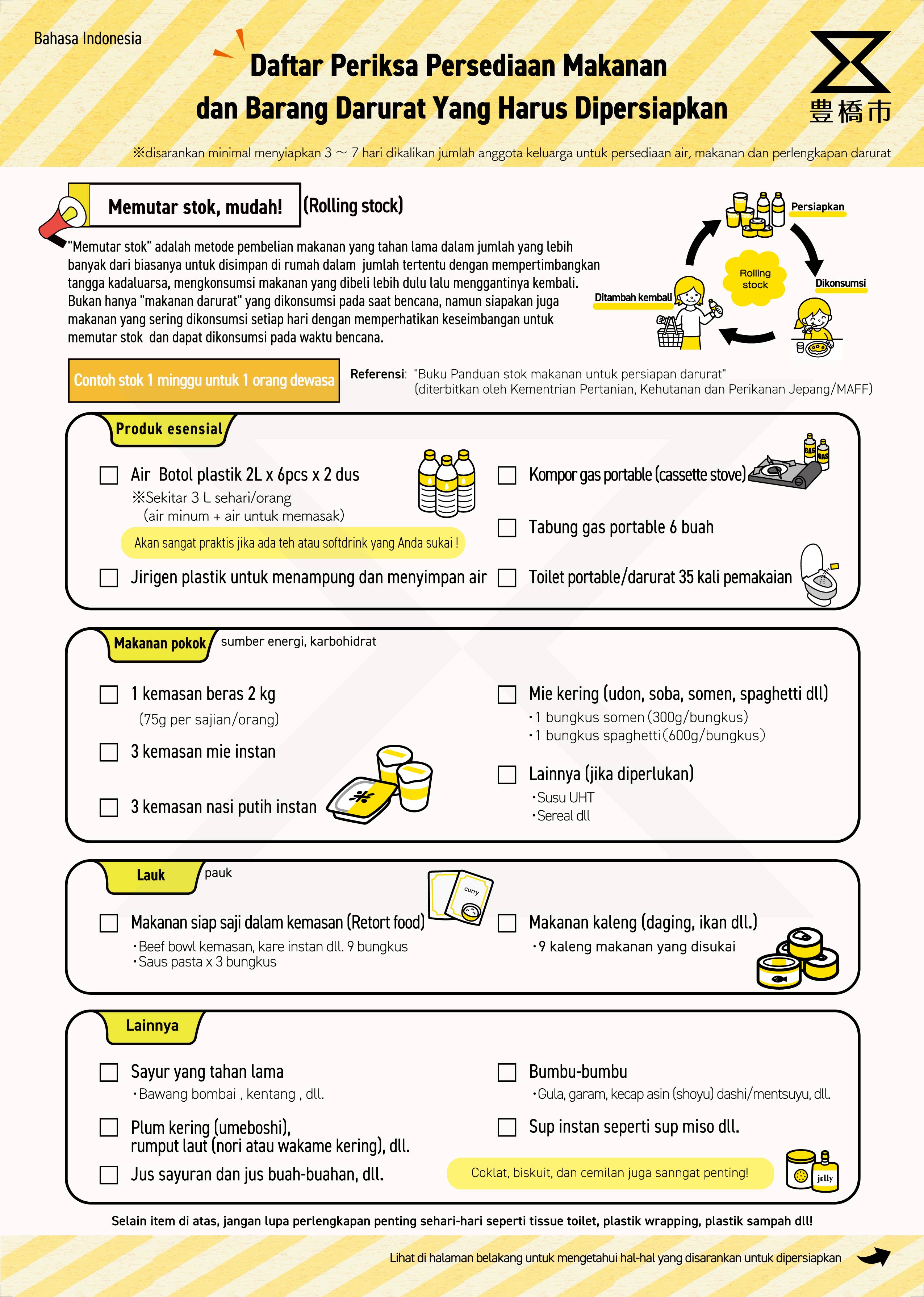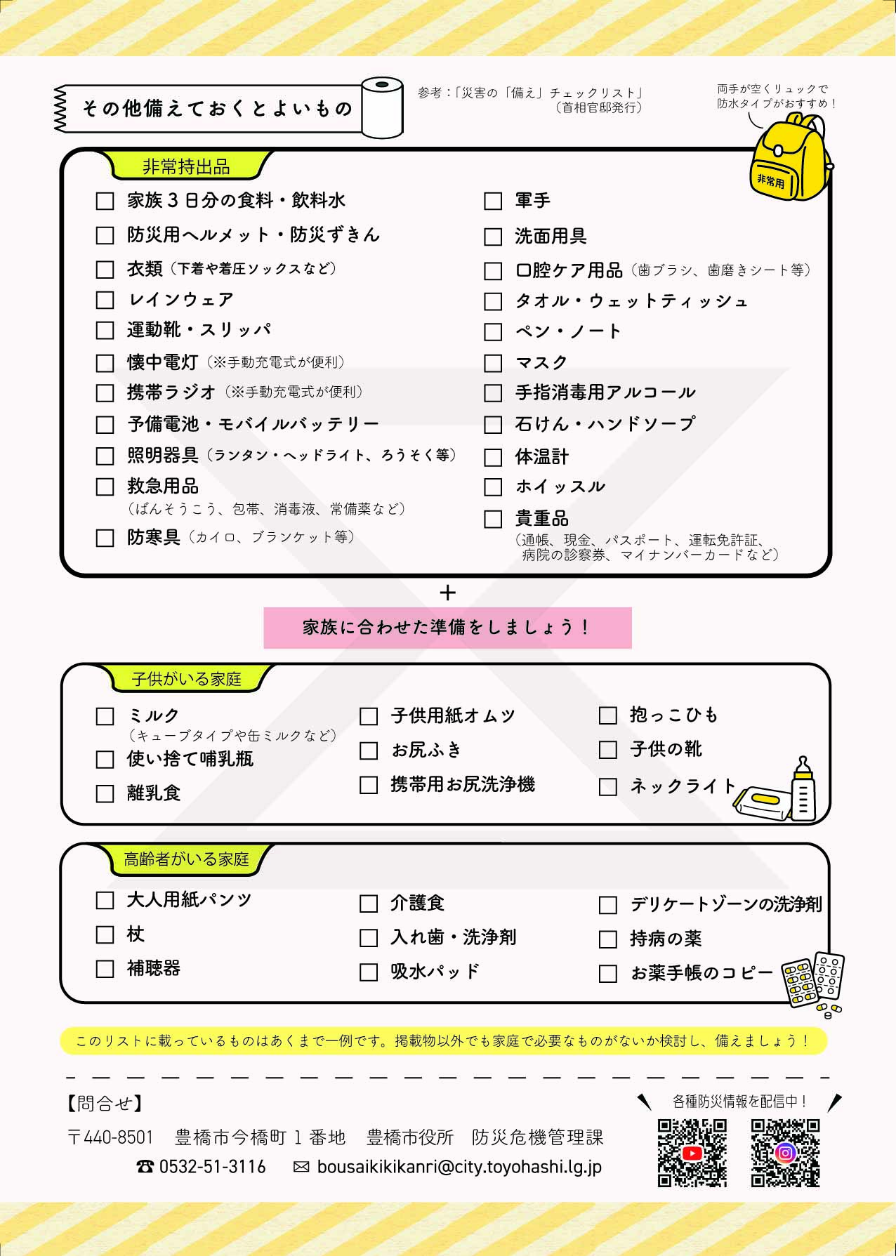 災害(さいがい)が起(お)きてから困(こま)らないよう、いまのうちに準備(じゅんび)しましょう。