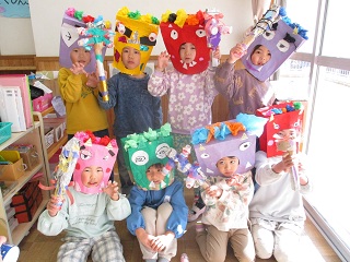 「おにはそと!」「ふくはうち!」鬼に向かって、新聞紙で作った豆を投げました。鬼を退治した後は、福の神からお菓子をもらって食べました!
