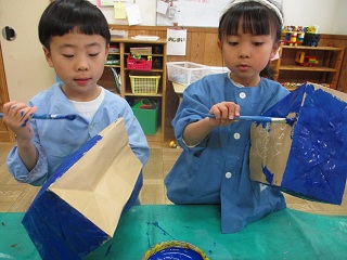 絵の具を塗って鬼のお面を作りました!「どんな目にしたら強そうかな?」「髪の毛はどうしよう?」考えながら作りました。豆まき会では、0.1歳児クラスの子どもたちの鬼役に!!怖がらせないように気を付けながら鬼役をすてきに演じてくれて、みんなで節分に親しみました。