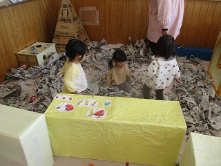 部屋いっぱいを使った新聞紙遊び。楽しいね!!