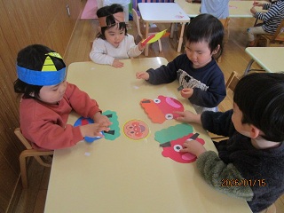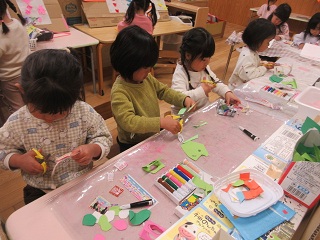 豆まき会に向けてお面づくりに真剣です。
