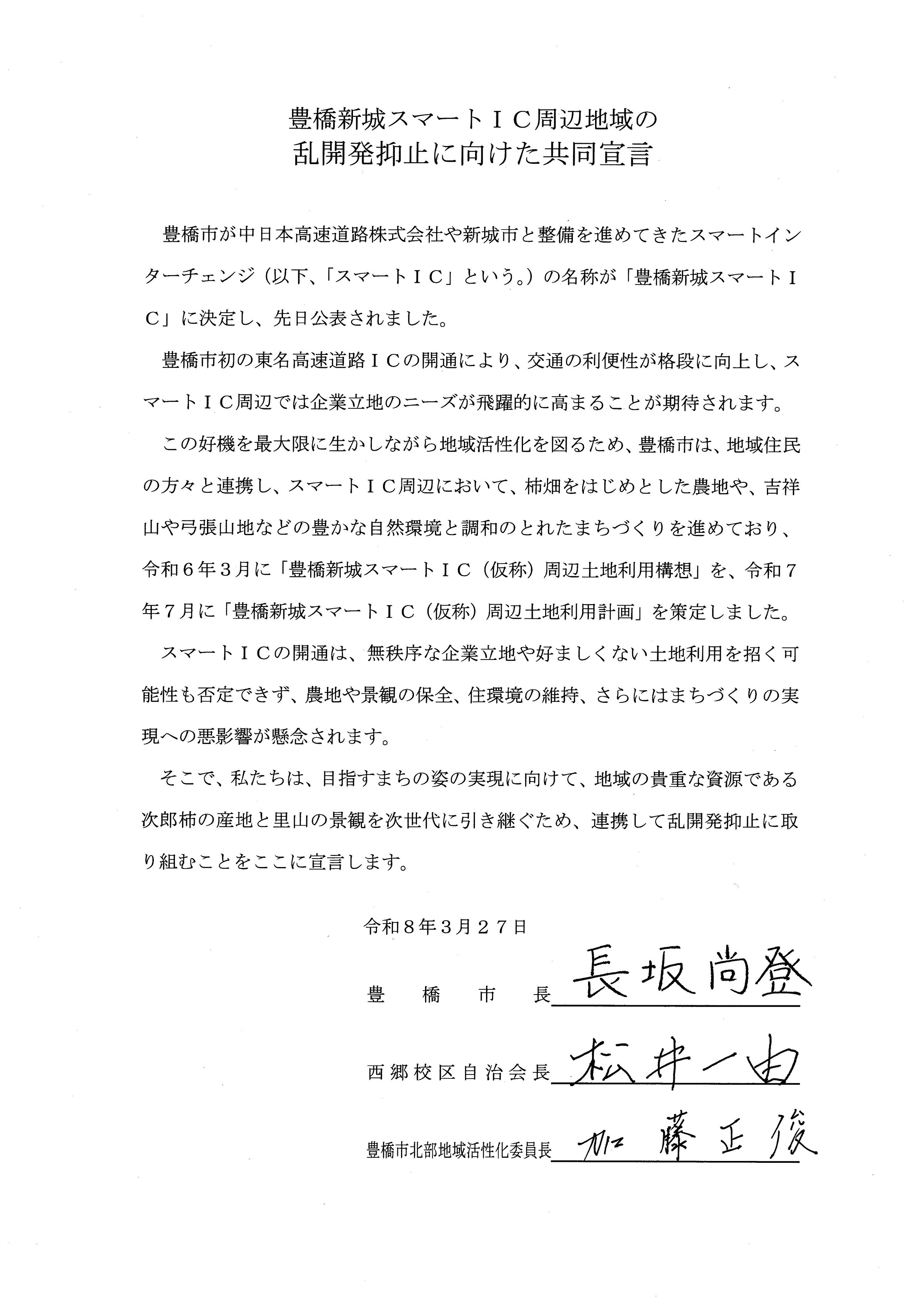 豊橋新城スマートIC周辺地域の乱開発抑止に向けた共同宣言
