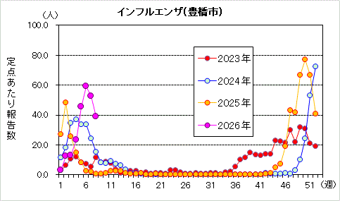 市内の流行状況の把握については、市内の定点医療機関から毎週報告を受けている「豊橋市内のインフルエンザ発生状況」をご覧ください。