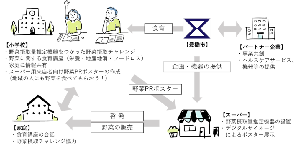 豊橋市では、令和5年度より市内小学校にて「ベジチェック」を活用した食育授業(野菜摂取チャレンジ)を実施しています。児童は野菜摂取量を測定し、1か月間で数値を増やすチャレンジに取り組みます。授業では測定のほか、野菜の機能、野菜摂取量を増やすコツについて伝えています。チャレンジ終了後、児童が作成した野菜摂取に関する啓発ポスターを近隣スーパーマーケットに展示することで、地域の方々にも野菜摂取を啓発しています。